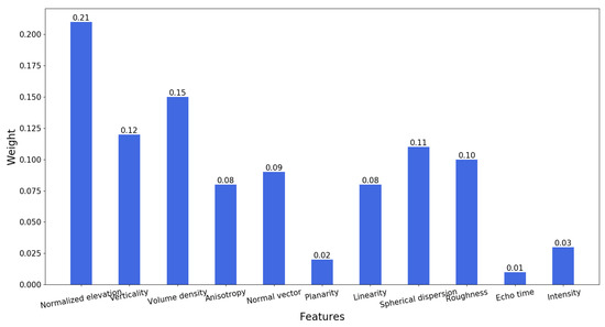 In this paper, we use the REF algorithm to evaluate the feature weights for normalized elevation, verticality, volume density, anisotropy, normal vector, planarity, linearity, spherical dispersion, roughness, echo time and intensity, as shown in Figure 10. The weight of the normalized elevation is the largest, 0.21, and the weights of volume density, verticality, spherical dispersion, roughness, normal vector, anisotropy, linearity, intensity, planarity and echo time are 0.15, 0.12, 0.11, 0.10, 0.09, 0.08, 0.08, 0.03, 0.02, 0.01, respectively.