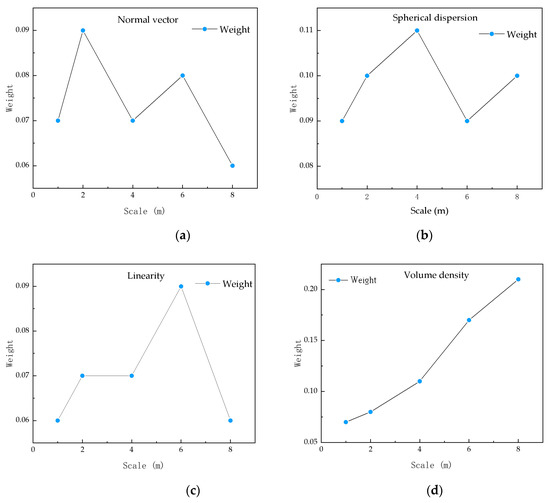 According to the ranking of feature weight evaluation, we select the top eight features by weight to calculate the multi-scale feature set. The top eight features are normalized elevation, verticality, spherical dispersion, roughness, normal vector, anisotropy, linearity and volume density. We use the selected neighborhood size in Section 2.2 to calculate point cloud features with neighborhood radii of 1 m, 2 m, 4 m, 6 m and 8 m, respectively, to obtain a multi-scale feature set containing 40 groups of features.