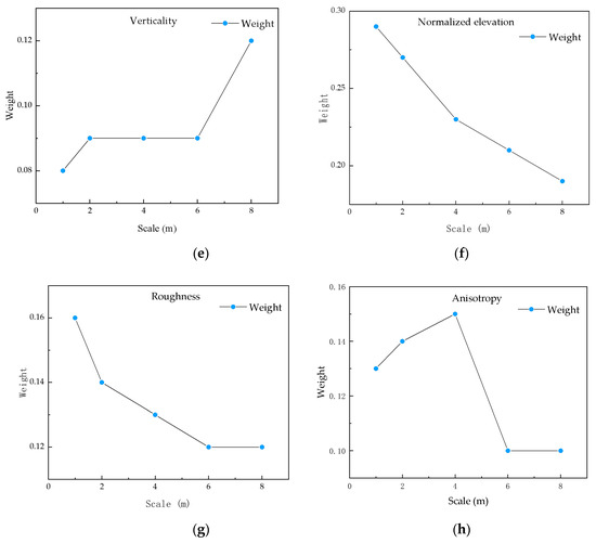 The SBS algorithm is introduced to select the multi-scale feature set. According to the correlation between ground objects and features, we get the importance distribution of each feature at different scales. In Figure 11, the best neighborhood of eighty features, i.e., normalized elevation (r = 1 m), verticality (r = 8 m), roughness (r = 1 m), normal vector (r = 2 m), anisotropy (r = 4 m), linearity (r = 6 m) and volume density (r = 8 m), spherical dispersion (r = 4 m), is shown respectively. The eigenvalues at the best scale of each of the above features are used to obtain the best feature subset.