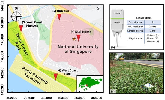 (a) Map of the nodal seismometer array deployed across the study area. The triangles denote the locations of the nodal seismometers and the star denotes the location of the weather station. The sites are named (1) NUS hilltop, (2) NUS exit, (3) West Coast Highway, and (4) West Coast Park, respectively. All four sensors are placed within a one-kilometer radius. (b) Picture of the Smart Solo IGU-16 3C nodal seismometer and specs of the sensor. (c) A picture of the sensor deployment in the turf grass by the road.