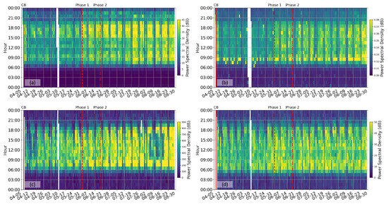 Cumulative power spectral density (PSD) between 1 Hz and 30 Hz at (a) NUS hilltop, (b) NUS exit, (c) West Coast Highway, and (d) West Coast Park, respectively. The solid red line denotes the beginning of the Circuit Breaker (CB). The two dashed red lines denote the onset of Phase 1 and Phase 2 opening according to Singapore policy, respectively. The horizontal ticks are days in the calendar year of 2020, and the vertical ticks are hours in local time. The white stripes correspond to time periods when data were missing.
