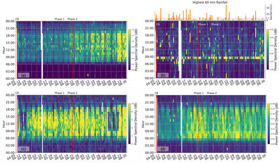 In contrast, Figure 3 compares the cumulative PSD at each site between 30 Hz and 150 Hz. At this high-frequency band, ambient seismic energy is one to two orders of magnitudes weaker than at the low frequencies (Figure 2) due to the increasing attenuation of the higher-frequency seismic waves. Therefore, energy recorded within this high-frequency band is more likely emitted within a few meters of the sensor, providing more site-specific information. Figure 3 shows significantly different daily and long-time patterns at four sites. The NUS exit site (Figure 3a) is the only site maintaining the same day–night variational pattern as its low-frequency counterpart. Activity around this site picks up at 7 am and dies off at 11 pm. At the NUS hilltop site (Figure 3b), the high-frequency energy focuses on constant 8 am events throughout the monitoring period. In addition, a dozen sporadic occurrences (shown in bright yellow strips) correspond to the tropical thunderstorm events during the five-month monitoring time. To support these observations, rainfall data at the Kent Ridge weather station (denoted by the orange star in Figure 1) are plotted on top of Figure 3b. It is obvious that these large energy events occur on days with intensive tropical downpours (defined by the highest 60 min rainfall greater than the mean value of 6.3 mm). Compared to daily meteorological data, seismic data resolve the thunderstorm events with hourly resolution.