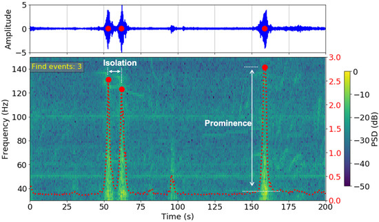 In this study, we quantify specific activity information from the vibration measurements of the seismometers at the high-frequency band (above 30 Hz). We unwrap the entangled information in the time domain records in its two-dimensional spectrogram representations. As each passing motor vehicle directly impacts the ground near the seismometer, its seismic signature has a short duration (about two seconds) and a wide frequency band that stands out from the background noise level [16]. Therefore, we use Hanning windows of 0.5 s with 12.5% overlap to compute the PSD of the continuous record. We then sum the energy between 30 Hz and 150 Hz and identify each energy peak as an individual motor vehicle. The peaks are defined by two parameters: the relative height of the peak (prominence) and the time interval between the two nearest peaks (isolation), which are tuned according to site conditions. There are four lanes on the roads at the NUS exit and the West Coast Park sites, but six lanes on the West Coast Highway. Therefore, the prominence and isolation parameters are tuned differently (Table 1). As an example, we illustrate the process of identifying three motor vehicles in Figure 4.