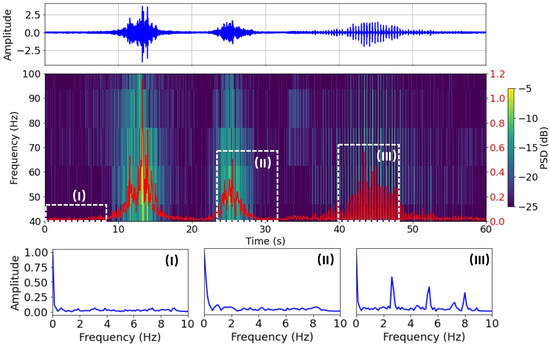 Illustration of the method for runner identification. Top panel: N-component seismic data filtered between 40 Hz and 100 Hz. Middle panel: spectrogram of the seismic data. The overlying red line is the total PSD summed between 40 Hz and 100 Hz. Bottom panel: normalized amplitude spectra of three 8-second segments of the PSD corresponding to background noise (I), motor vehicle signal (II), and runner signal (III). The runner signal is identified by strong harmonics.