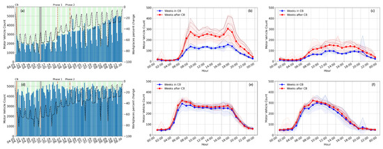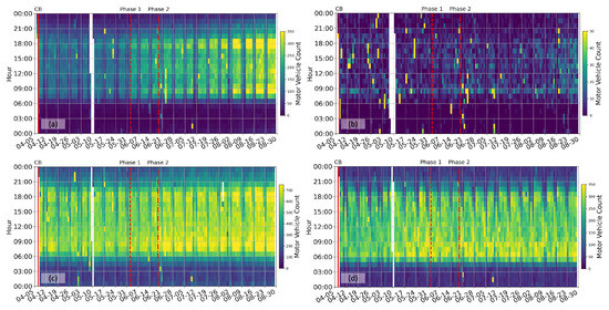 The access road at the Pasir Panjang Terminal Port witnesses a relatively constant flow during CB and different phases of opening (Figure 6d), serving primarily heavy container trucks that travel in and out of the port terminal. Singapore maritime ports are the only ones around the world that operate 24 h a day, seven days a week. Truck drivers, working 12-h shifts, are part of the essential workforce that sustains the lifeline between the island of Singapore and the rest of the world. As a result, the traffic volume does not vary as the government restrictions but follows the demands of international maritime transport. We observe a minimum traffic flow of around 50 motor vehicles per hour each day from 22:00 to 3:00 (Figure 7e,f), while the peak traffic flow of around 300 vehicles per hour is observed from 6:00 to 18:00 on weekdays, and from 9:00 to 12:00 on weekends. The results show that, given the choices of working shifts, significantly more drivers choose to work during daytime shifts and during weekdays.