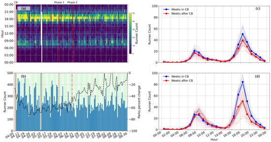 Although CB disrupted the work habits of most urban residents, it did not drastically change the cycle of their recreational habits. CB in Singapore promoted evening workouts, especially during weekends. The number of evening runners slightly increased towards the later period of CB, which suggests a gradual increase in public concern towards maintaining active and healthy habits. This concern could have resulted from a gradual development of psychological fatigue from lockdown measures (e.g., [34,35]). The increased running activity stressed the importance of accessibility to open green areas in an urban environment during a time of crisis [36]. As soon as Phase 1 opening started on 1st June, the peak number of runners decreased, and the peak time of running activities shifted to a later time. In particular, a significant decrease in the Sunday evening runners was observed after Phase 2 opening, which suggests that a significant psychological strain was placed when people expect the start of a new working week. These data are paramount to sociological studies of human behavior in order to support government mitigation policy and individual response to the pandemic [37,38,39].