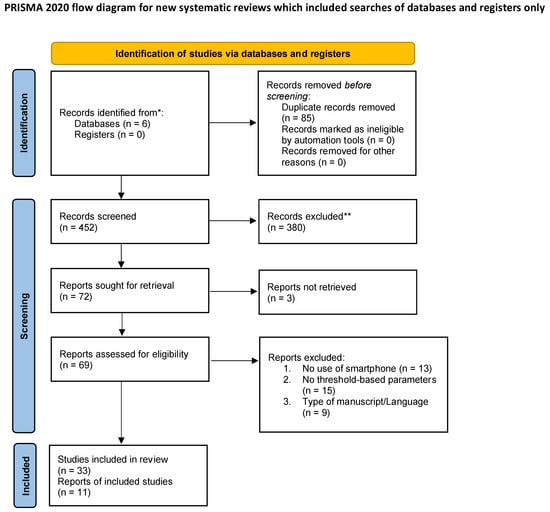 Study selection flow chart. Flow chart describing the study selection process according to PRISMA guidelines. (From: Page MJ, McKenzie JE, Bossuyt PM, Boutron I, Hoffmann TC, Mulrow CD, et al. The PRISMA 2020 statement: an updated guideline for reporting systematic reviews. BMJ 2021;372:n71. doi: 10.1136/bmj.n71; For more information, visit: http://www.prisma-statement.org/) (accessed on 30 August 2022). * Consider, if feasible to do so, reporting the number of records identified from each database or register searched (rather than the total number across all databases/registers). ** If automation tools were used, indicate how many records were excluded by a human and how many were excluded by automation tools.
