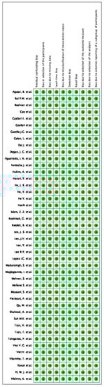 The bias risks of selected studies were assessed with the help of the ROBINS-I tool of the Cochrane Library for nonrandomized studies. A description of individualized bias and cross bias is shown in Figure 2 and Figure 3, respectively.