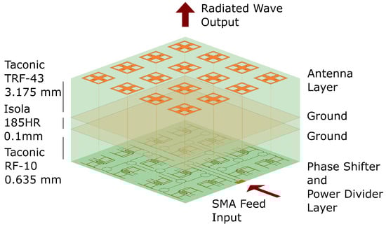 The antenna array structure is shown in Figure 1. It consists of three main designs: power divider, phase shifter, and antenna. The power divider and phase shifter were designed on a Taconic RF-10 substrate ( = 10.2, tan = 0.0025) with a thickness of 0.635 mm. For the antenna design, Taconic TRF-43 substrate is utilized. The thickness is chosen as 3.175 mm and the material properties are = 4.3, and tan = 0.0035. Additionally, there is a 0.1 mm thick bonding layer, Isola 185HR, to co-join the two substrates together.