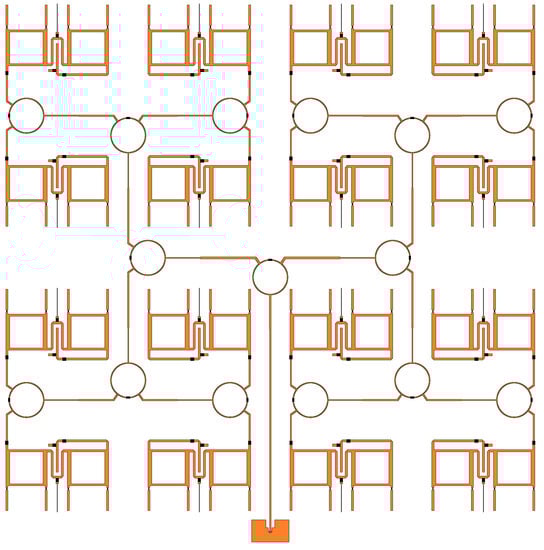 A Wilkinson power divider is employed for the power division. A ring structure is used for the 70.71 Ω section to reduce its footprint. A 100 Ω resistor is embedded into the ring, completing the structure. In total, there are four levels of power division. Therefore, the ideal power at each output is −12 dB.