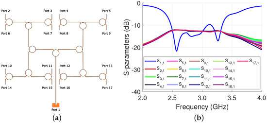 The input and output of the power divider are initially designed as 50 Ω and optimized with Ansys HFSS to provide an equal power division to the unit cells while having a low reflection loss. Its simulation results are shown in Figure 3b. The average output is −12.8 dB, meaning that there is 0.8 dB of loss. The is −13.0 dB with a −10 dB bandwidth of approximately 20%.