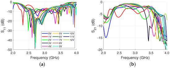 The structure of Figure 5 is simulated from 2.0 GHz to 4.0 GHz and the varactor voltage is swept from 0 V to 12 V. To model the varactor, (4) is used with values from the datasheet [30]. The and results are presented in Figure 6. The average and at 3 GHz are −11.1 dB and −1.7 dB, respectively. The total phase shift is 437. This is an initial model that will later be updated accordingly in Section 3 based on measurement results.
