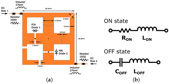 Macom MA4AGP907 was chosen as the PIN diode for the polarization control. The equivalent circuits shown in Figure 7b represent the ON and OFF state, respectively. Based on the datasheet [33], the parameters for the ON state were chosen as and . For the OFF state, the parameters are and .