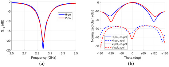 Simulation results of a single antenna at broadside: (a) for both polarizations; and (b) normalized gain at 3 GHz for both polarizations.