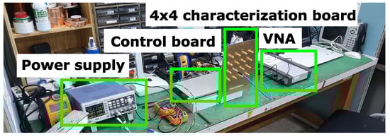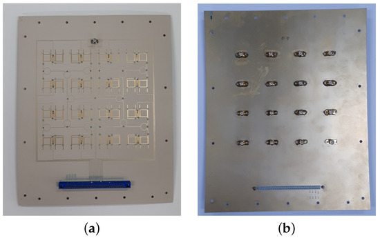 In order to determine the overall phase shift of the structure, a board containing only the power divider and phase shifter was fabricated, shown in Figure 9. An SMA connector was soldered to each output of the 16 unit cells as is displayed in Figure 9b. The unit cells were measured one by one with an Anritsu MS46122B VNA by adjusting the respective unit cell’s bias voltage for varactors from 0 V to 12 V in 1 V steps. The other unit cells were terminated with a 50 Ω load. The voltage control was performed with a third-party control board that was custom made for this work based on specifications provided by us. The measurement was repeated with an identical board to collect sufficient data for an average model of the phase shift at several bias points. The measurement setup is shown in Figure 10.