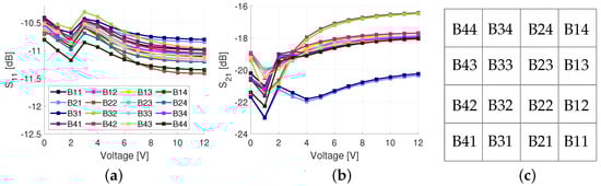 and results are shown in Figure 11. In the legend, codes representing each unit cell are shown. The position of each unit cell is mapped in Figure 11c which represents the phase shifter and power divider layer illustrated in Figure 2. The average and were −10.9 dB and −18.9 dB, respectively. Ideally, the would be −12 dB, however, due to the losses in the power dividers, phase shifters (imperfect reflection), and non-ideal conductors, the electroless nickel immersion (ENIG) surface finish and surface roughness, there was 6.9 dB of additional loss on average. These surface finish and surface roughness losses are discussed in greater detail in Section 4. The variation in loss between different bias voltages is due to the changing reflection coefficient of the RTPS. The highest loss is at 1 V and, in this case, the series inductance and capacitance are in resonance, i.e., (4) is close to zero. In this case, the reflection coefficient is purely based on the internal resistance of the varactor ( in Figure 4). Additionally, imbalanced power division was observed for unit cells near the feed of the structure, i.e., B21, B22, B31, and B32. This was also observed in the simulation results of Figure 3, however, the difference between the highest and lowest loss was only 0.2 dB. The higher losses caused by the non-ideal conductors, ENIG, and surface roughness are believed to have increased this difference even more.
