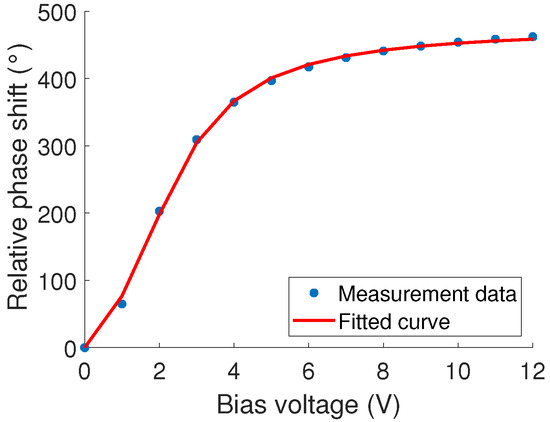 To obtain an updated varactor model with the measurement data, a curve fit was performed with MATLAB’s built-in curve fit toolbox by tuning the parameters of (2) with the minimum square error (MMSE) technique. While tuning, the phase shift at different bias points was calculated with (3) and compared to the measurement data. This was iterated until the error between the calculations and measurement results was minimized. The result of the curve fit is in Figure 12, showing good agreement with the measured data. The varactor model parameters obtained from the curve fit are presented in Table 1. Although these values emulate the phase profile well, they are not expected to be accurate in terms of inductance and capacitance. Therefore, a frequency shift in simulation results is expected when compared to measurements. In future work, the goal is to improve this method to accurately capture the inductance and capacitance values as well. Nevertheless, it is sufficient for beam steering purposes as will be demonstrated in Section 4.