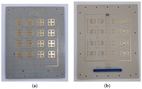 Fabricated structure: (a) antenna side; (b) phase shifter and power divider side.