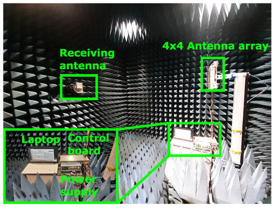 The measurement was performed in an anechoic chamber shown in Figure 14. The control board was connected to a power supply. These were placed along the laptop on a platform which rotates 360 on each 2D scan. The communication protocol between the laptop and control board is serial-to-USB. The antenna array was connected to the control board with 2 m-long cables. The transmitted power was measured with a horn antenna that can be rotated 90 in order to measure the different polarization states providing the cross-polarization levels as well. The measuring resolution of this setup is 1.