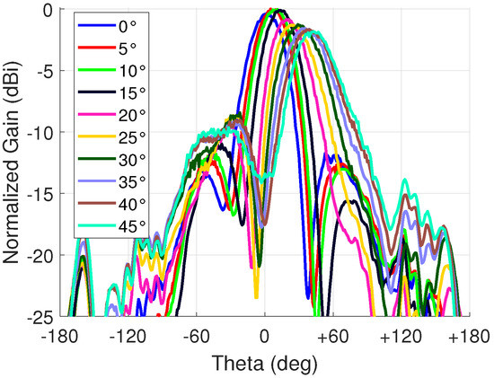 Improved results can be achieved by characterizing each unit cell individually as was performed in Lau et al. [15]. However, the characterization method was not mentioned. Additionally, the steering accuracy was not discussed and it was visually confirmed that the steering angles of > in Figures 13–16 are not exactly at the claimed angles. There were also gain variations between different steering angles.