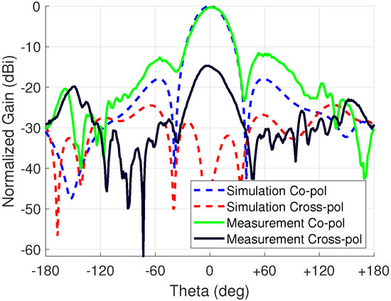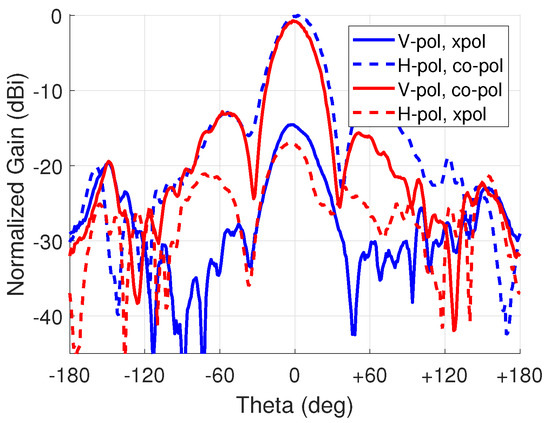 The antenna was simulated in HFSS in both horizontal and vertical polarization states. The results of the broadside radiation pattern at are shown in Figure 8. When the antenna was set to the horizontal polarization state, the at 3 GHz was −20.2 dB with a fractional bandwidth of 4.0%. The peak gain was 3.2 dBi. In the vertical polarization state, the was −21.9 dB with a fractional bandwidth of 4.1% and a gain of 3.5 dBi. Both polarization states have a XPD of over 30 dB.