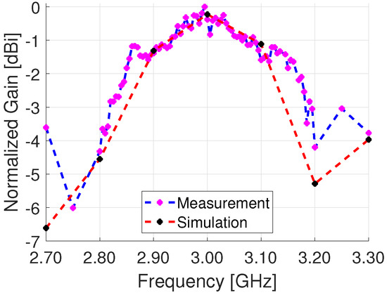 In Figure 17, the normalized peak gain at a frequency range from 2.70 GHz to 3.30 GHz is shown for a broadside pattern at 0. The peak gain is close to the center frequency of 3 GHz at 2.995 GHz with a gain of 4.7 dB. The frequency bandwidth where gain decreases −3 dB from the peak gain is 0.36 GHz. The same plot also has the simulation results which show good agreement with the measurements around the center frequency of 3 GHz.