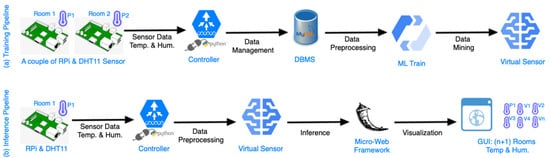 Figure 2 illustrates the operational logical flow of the proposed solution. As it can be seen, there are two pipelines. The first pipeline, aims to train the virtual sensors. This includes all the steps, beginning from the deployment of physical sensors of the IoT devices, until the construction of the ML models that will replace them. The second pipeline has as a goal to extract the inference data from the virtual sensors. In particular, this inference pipeline begins with the monitoring of one physical sensor, and it provides the physical measurements to the virtual sensors that are the output of the training pipeline, and eventually, the virtual sensors infer the temperature and the humidity in every room.