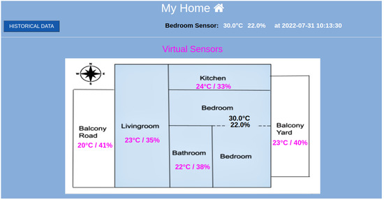 Figure 3 depicts the smart home that will be used in the experimental evaluation. The bedroom is set as the reference room, where the permanent physical IoT device is placed. The temperature and humidity measurements of the reference room are depicted in Figure 3 using black fonts. The corresponding measurements of the virtual sensors in the target rooms are depicted with pink fonts. The monitoring data are depicted as time series plots in Figure 4 and Figure 5. Specifically, Figure 4 illustrates the time series metrics of the temperature and humidity in the reference room, while Figure 5 depicts the monitoring data of the second physical sensor in a target room that will be replaced by the virtual sensor.