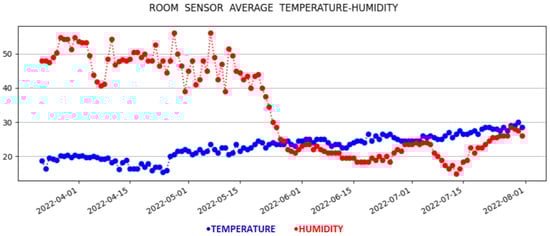 Through the application, the user has access to the measurements made for each room (physical measurements for the reference room and virtual measurements for the target rooms) in real time. Additionally, the user has the opportunity to see the historical data, along with detailed information regarding the average, max, and min values of the temperature and humidity for each day, since the start of the measurement period, as depicted in Figure 4 and Figure 5. Specifically, a graph presents the change of the average temperature and humidity for the rooms in question over time, using the Matplotlib library, which is a comprehensive library for creating static, animated, and interactive visualizations in Python. These data can be of great importance, if they can be used with other applications of a smart home, such as smart metering, HVAC applications, etc., to create a better living environment, while making energy and cost efficient decisions.