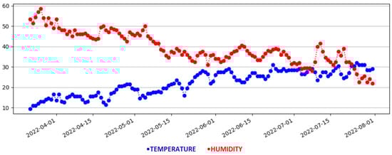 RPi devices are characterized as low cost, fully customizable, programmable, portable size computer boards. These characteristics make them well-suited for IoT platforms. Their high connectivity capabilities also allow them to directly connect to other devices and applications through Wi-Fi, Bluetooth, and other access protocols. An additional physical interface with the outside world is the general purpose input–output (GPIO) connector. The GPIO is a 40-pin port that enables the RPi to communicate with physical devices such as sensors and actuators. In the proposed IoT platform, a DHT11 sensor is attached to the GPIO. Next, using the python libraries of RPi.GPIO (https://pypi.org/project/RPi.GPIO/ (accessed on 9 December 2022)) and dht11 (https://github.com/szazo/DHT11_Python (accessed on 9 December 2022)), and a python script was written that takes the temperature and humidity measurements.