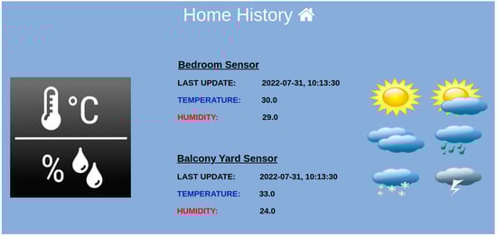 The servers communicate via Wi-Fi to the client at a specific IP address and port. The client establishes a connection and receives the temperature–humidity measurements, along with their timestamps. The socket-based communication is a stateful protocol that facilitates the data storage. In the proposed framework, the client periodically sends a message to the server to get the temperature and humidity measurements—after, it decodes and splits them, and, finally, stores them in the database. It should be noted that other protocols could be used, such as MQTT, without changing the design of the proposed IoT platform. However, since in the proposed implementation, the Pi’s are relatively computationally strong devices and the power supply for the particular implementation is available, it was decided to use socket-based communication. For other types of applications, with more constrained IoT devices and less efficient access networks, more light-weight protocols, such as CoAP or MQTT, could be used instead.
