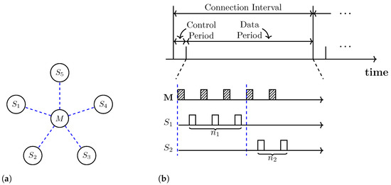 In this study, we consider a WSN model that consists of one master and multiple slaves connected to the master in a star topology, as shown in Figure 1a. All communication occurs between the master and one slave at a time, and the master switches between slaves via TDMA. A slave can transmit packets only when granted permission by the master. These characteristics of our model are similar to those of the BLE-connected mode in [13,14]. In fact, our network model can be viewed as an extension of the BLE-connected mode to accommodate additional functionalities required for AI-based scheduling.