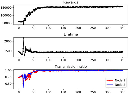 In Figure 4, we evaluate the performance of the DQN-based scheduler in terms of the cumulative reward, network lifetime, and transmission ratio by increasing the number of episodes to be learned. As shown in the figure, all three metrics converged while learning 350 episodes. In particular, the convergence became clear and steady after 100 or more episodes. According to the experimental results, the cumulative reward, network lifetime, and transmission ratio converged to , 1450, and , respectively. It was peculiar that a sharp increase in the network lifetime was observed around the 15th episode. This was caused by the action of ‘never transmitting’ becoming dominant during the early stage of learning. Note that our reward function in (6) was designed to favor a longer CI and no packet loss. Thus, a simple policy of ‘transmitting no packets, but taking the maximum CI’ can result in a relatively longer network lifetime. Obviously, this simple policy cannot be optimal, since the DQN-based scheduler maximizes the cumulative reward rather than the network lifetime. Consider that the value of the transmission ratio around the 15th episode is very low, whereas the corresponding network lifetime is large. Since the rewards are roughly a product of the network lifetime and transmission ratio, the value of cumulative rewards around the 15th episode remains almost unaffected. This suboptimal policy was overwhelmed by better policies and was eventually filtered out through learning.