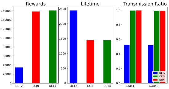 Average cumulative reward, network lifetime, and transmission ratio for the DQN and DET. DET2 and DET4 denote the DET cases with packet lifetimes of 2 and 4 s, respectively.