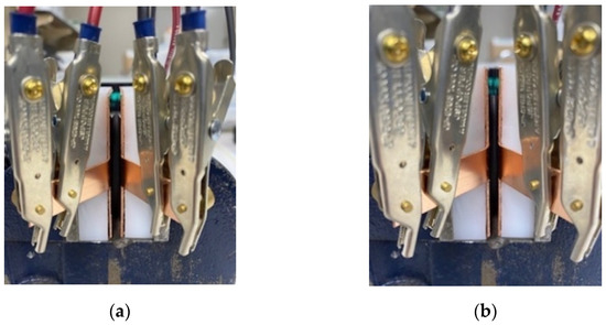 Volume resistivity is calculated from geometric factors and experimentally-derived resistivity measurements. For resistance experimentation, a four-point probe method, well-known in the literature [38,39], is used. The four-point probe technique involves bringing four probes in contact with a material of unknown resistance. A direct current is forced between the outer two probes, and a voltmeter measures the voltage difference between the inner two probes. A Keithley 2410 Source meter was used to carry out the four-point probe measurements. To eliminate sources of variation (i.e., contact resistance between components, irregularity between compression, etc.), a fixture, as shown in Figure 1, was used to compress the seal uniformly and measure the conductivity of the seals at various levels of seal compression. The fixture uses copper plates insulated with Teflon® to connect the samples to the Source meter and a vice to compress the seals to various levels of compression. The four-point probe measurement was carried out in constant current mode, set to 100 mA. The samples were placed in the vice and closed to have light contact with the fixture for the 0% compression levels.