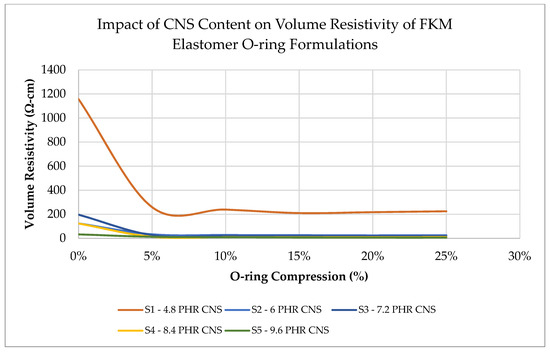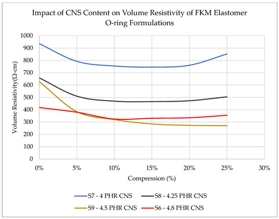 Effect of CNS content in the range of 4.8 to 9.6 PHR within elastomer O-rings on volume resistivity across multiple compression levels.