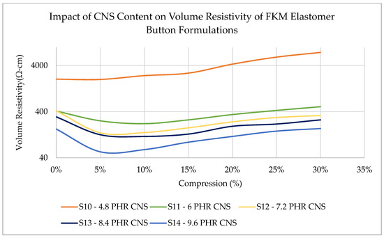 Effect of CNS content within elastomer buttons on volume resistivity across multiple compression levels.