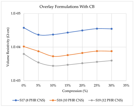 Testing was initially performed on samples 15–19 per the procedures outlined earlier in the experimental section. Samples 15 and 16 (4 and 6 PHR CNS, respectively) did not register any conductivity at 0% compression and were not tested any further. The results from the rest of the samples (17–19) can be seen in Figure 5 below.
