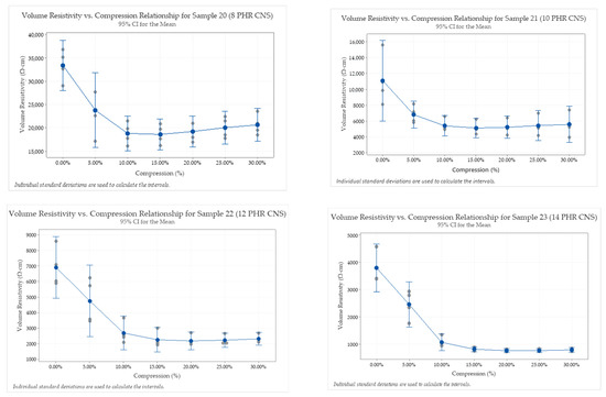 To isolate the impact of the CNS material on the resistivity versus compression effects, several samples (samples 20–23) were formulated without the Carbon Black fillers. In other words, only CNS material was used as filler content for the QTC elastomer samples. Figure 6 demonstrates samples having only CNS additives in amounts from 8, 10, 12, and 14 PHR. Each formulation test included four repeats to verify experimental repeatability.