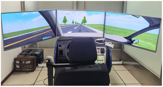 The North China University of Technology driving simulator (NCUT Sim) was used for this experiment (as shown in Figure 1). The hardware system is composed of a cockpit and the annular display screen. The cockpit includes the dashboard, steering wheel, seat, automatic gearbox and other components, which are in full accordance with a real vehicle. Three 46-inch-wide LCD screens are adopted to present the driving environment for the participants. The road scene modeling is built by the 3D virtual reality simulation software UC-win/RoadVer.14.1.0, and simulated driving scenarios are projected on the display screen (with a resolution of 1920 × 1080 pixels) through the control center directly. During the experiment, more than 60 vehicles and related road parameters such as speed, acceleration, accelerator, and brake pedal opening can be collected simultaneously, with the sampling frequency at 50 Hz.