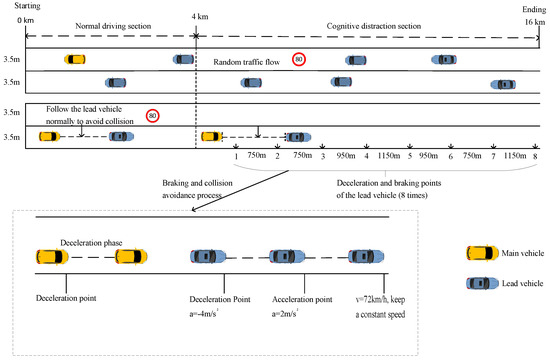 This experiment simulates the road environment of a 2-way, 4-lane urban expressway, with a central barrier, lane width of 3.5 m. There is no pedestrian lane and a non-motorized lane on both sides of the road according to the “Urban Road Engineering Design Specification”. The speed limit of the road is 80 km/h, where the speed set by the lead vehicle can reach up to 72 km/h. As shown in Figure 2, the road section is divided into 2 parts, the normal driving section and the cognitive distraction section. The length of the normal driving section is 4 km. At the beginning of the experiment, the lead vehicle was stationary ahead of the driver, and when the participant was 50 m behind the lead vehicle, the lead vehicle began to accelerate at 2 m/s2 until it reached 72 km/h. In each drive, the lead vehicle would drive at a constant speed of 72 km/h and the main vehicle stopped at the center of the outermost lane of the road at a distance of 50 m. The lead vehicle began to accelerate at an acceleration of 2 m/s2, and when the speed reached 72 , it began to drive at a constant speed of 72 km/h. The lead vehicle would brake 4 times with the deceleration rate of 4 m/s2 once it passed the predesigned deceleration points. For the normal driving section, participants were asked to drive as they normally would.