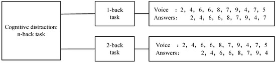 To investigate young novice drivers’ driving performance induced by cognitive distraction, numerous methods have been adopted in previous studies, e.g., math problems [40], digital reading of roadside signs [41], and n-back memory tasks [42,43]. The n-back task requires participants to respond verbally to a delayed digit recall task, and it allows for setting different difficulty levels of cognitive load [12]. This method was adopted. In this experiment, 2 levels of difficulty were designed, i.e., 1-back and 2-back. The 1-back task requires participants to memorize the digits and recall the number 1 back in the sequence; the 2-back task requires participants to memorize the current digits and recall the number two back in the sequence. For one cognitive task, a total of 10 digits would play randomly with an interval of 1.5 s. Figure 3 shows an example of the n-back task adopted in this experiment.