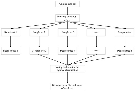 Random forest is an integrated learning method based on statistical learning theory and can be used as a classifier [45]. It is an extension of the decision tree. However, only 1 tree may reduce the accuracy of the classification model. Thus, random forest compensates the insufficiency by establishing a forest [46]. The bootstrap sampling method is employed by random forest to extract different training datasets with data putback from the original dataset. Each training dataset is used to generate a decision tree. The method of counting votes is adopted to record the output category of each decision tree [47], as shown in Figure 5.