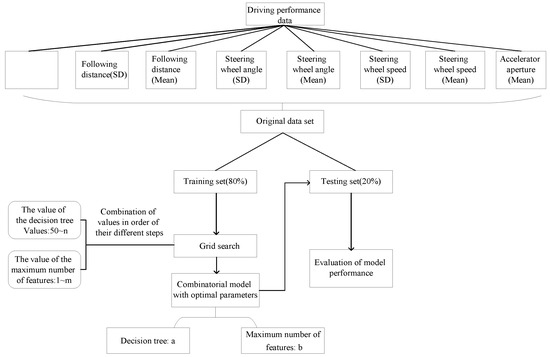 In this study, data were firstly labelled with −1 as the distracted driving and 1 as the normal driving. Data were divided into training dataset and testing dataset with the same proportion of SVM. For the random forest method, the number of decision trees has a direct effect on the computational efficiency and classification results. The efficiency of the algorithm may decrease if there are too many decision trees, while the classification accuracy may decrease with the decrease in decision trees [39]. Thus, a grid search was used in this paper to find the best parameterization. The random forest construction of this study is illustrated in Figure 6.