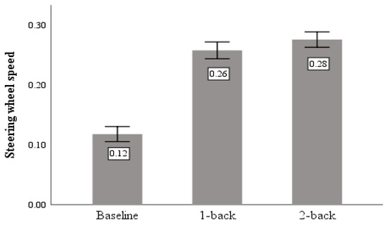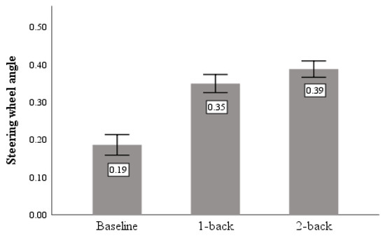 The steering wheel angle refers to the angle at which the steering wheel deviates from left to right during driving, and the magnitude of its rotation angle reflects the stability of the participants’ lateral vehicle control. As shown in Table 3, where a significant difference caused by task demand was found in the percentage of steering wheel turns above the 75% quantile (F = 73.486, p < 0.05). Figure 7 shows that the cognitive task produced a larger steering wheel angle than the baseline and that the steering wheel angle followed as the difficulty of the cognitive task increased.