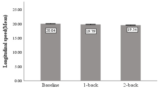 The average value of longitudinal speed represents the magnitude of the longitudinal speed of the vehicle during the subjects’ driving, as shown in Table 3. The cognitive distraction produced a significant difference in the average value of longitudinal speed of the vehicle (F = 5.457, p = 0.004 < 0.05). Figure 9 shows that the average value of longitudinal speed was higher when driving normally than when driving cognitively distracted.