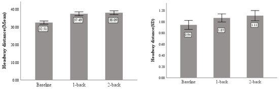 As shown in Table 3, significant differences caused by task demand were found for both mean (F = 39.618, p < 0.05) and standard deviation (F = 10.592, p < 0.05) of headway distance. Figure 10 shows that the average headway distance during cognitively distracted driving is lower than normal driving.