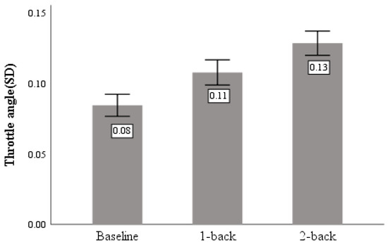 As shown in Table 3, significant differences caused by task demand were found for standard deviation (F = 13.836, p < 0.05) of throttle angle, but no significant difference between two levels of task difficulty was found. As can be seen from Figure 11, the standard deviation of throttle angle is positively correlated with the difficulty of the cognitive distraction task.