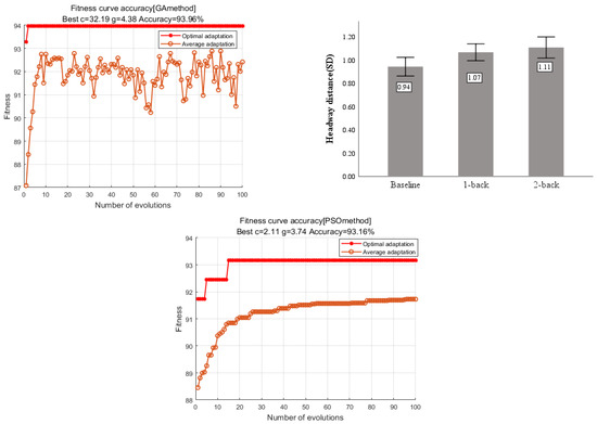 Figure 12 shows the parameter search results from the three optimization algorithms. Among the three optimization algorithms, GA provides the best accuracy is 93.96% when c = 32.19, g = 4.38 compared with the other two methods. The cross-validation accuracy of the PSO-SVM model is 93.16% when c = 2.11, g = 3.74 and the optimal classification accuracy of the CS-SVM model is 92.45% when c = 6.21, g = 2.44.