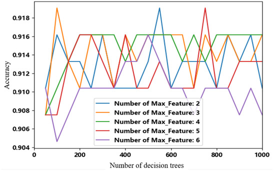 As shown in Figure 13, the model is trained by exhausting multiple super-parameter combinations, finding the optimal super-parametric combination according to the result of cross-validation for K = 5. It can be seen from Figure 9 that when the number of decision trees is 550 and the maximum number of features is five, the discrimination accuracy of the model can reach 91.91%, and the model can effectively discriminate the distracted state during driving.